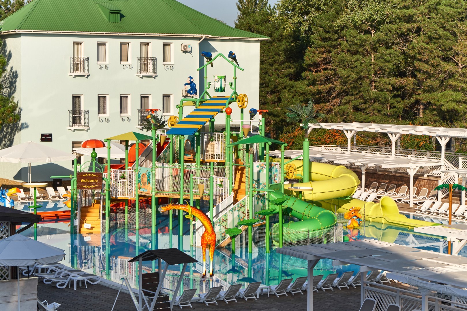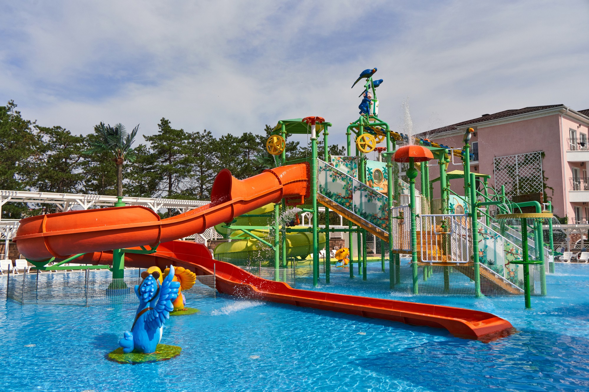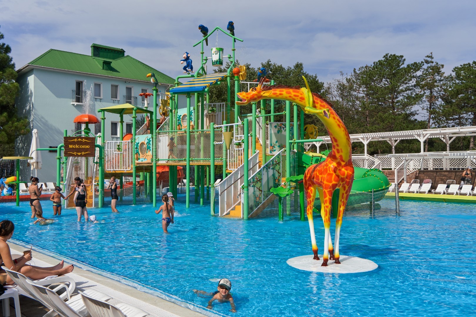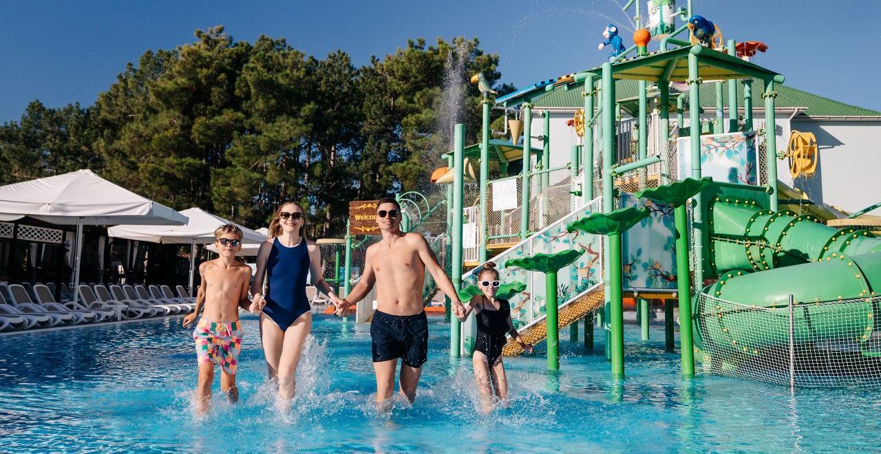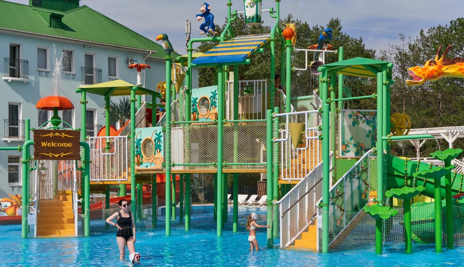 При благоприятных погодных условиях для детей работает новый акваплей - открытый подогреваемый детский бассейн с водными аттракционами 6+