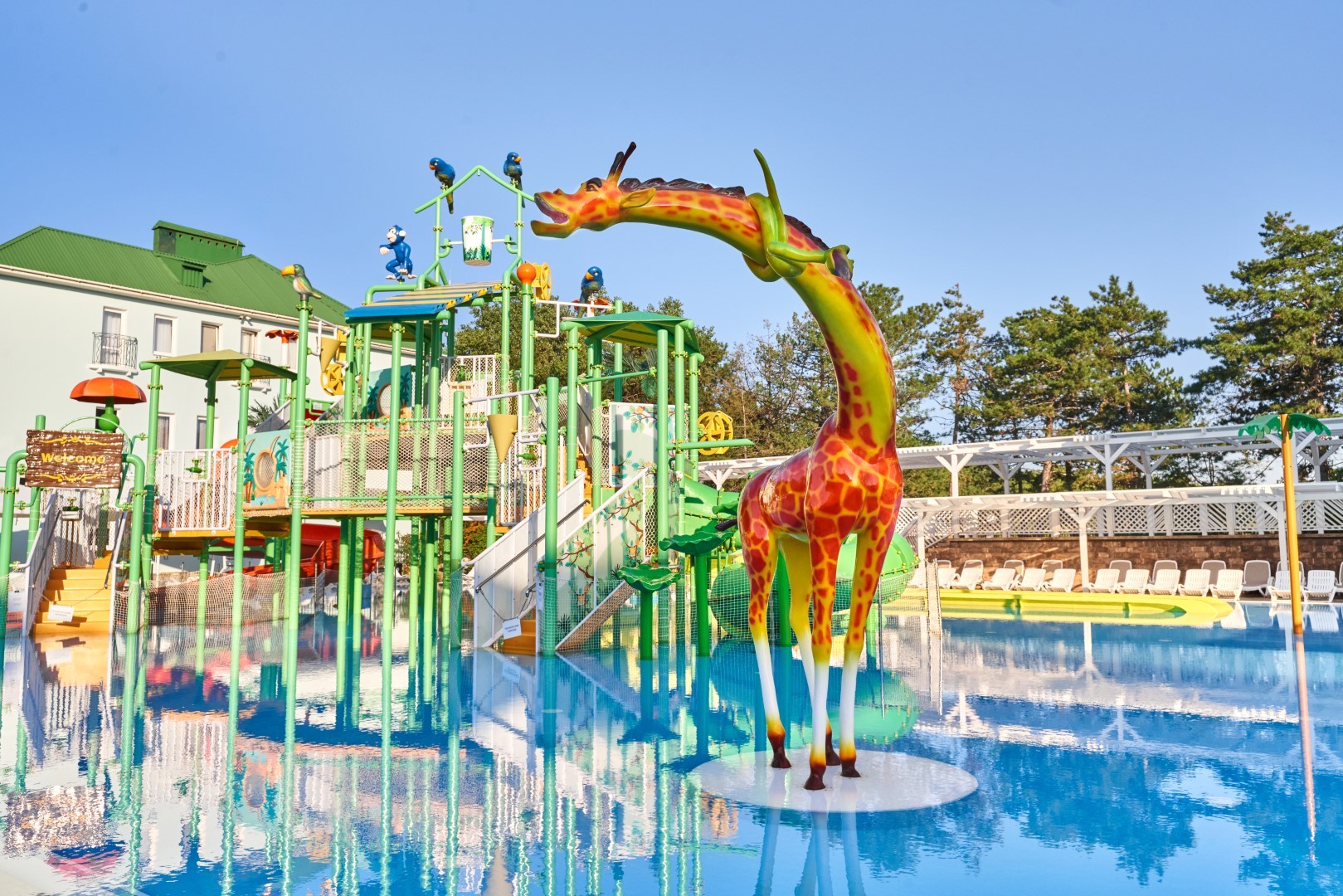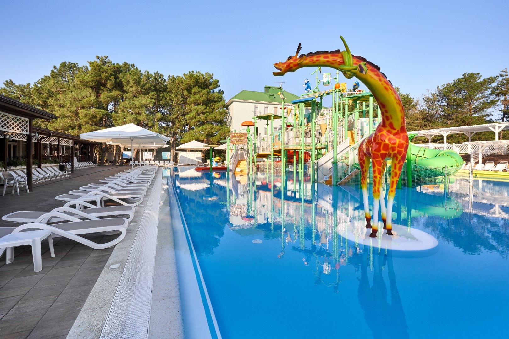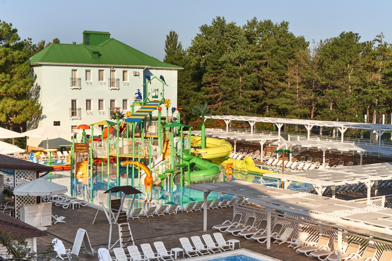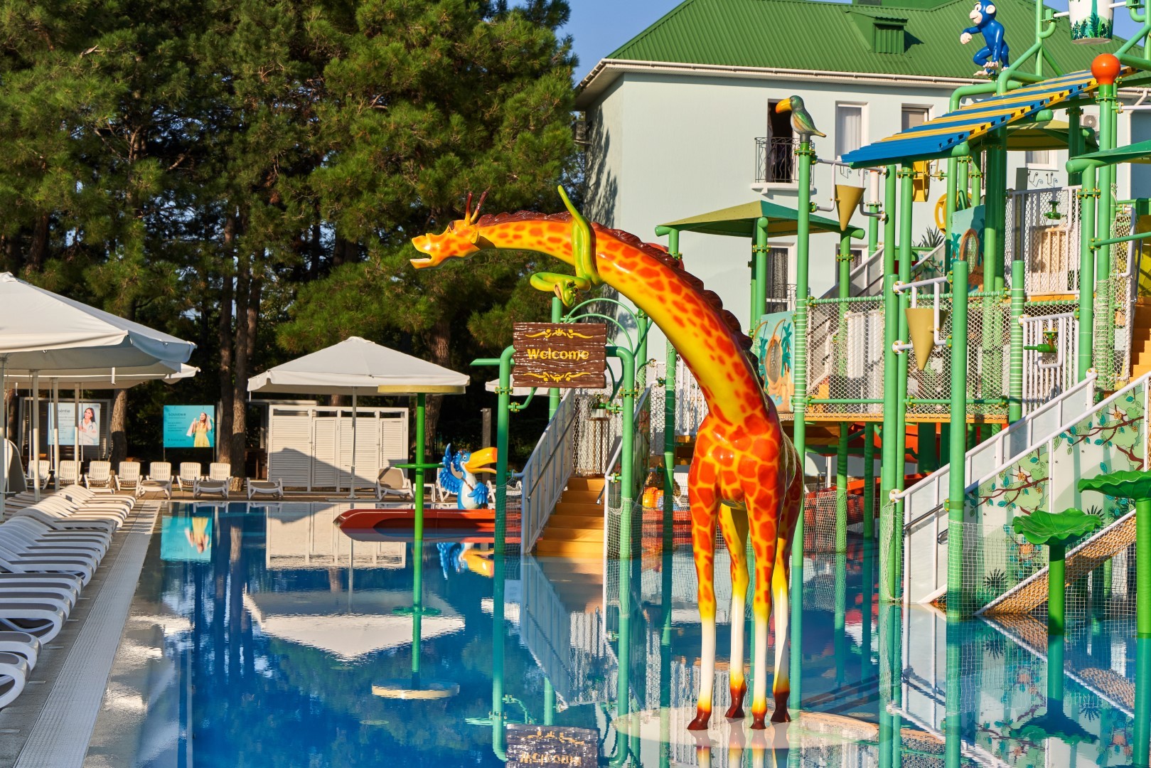 При благоприятных погодных условиях для детей работает новый акваплей - открытый подогреваемый детский бассейн с водными аттракционами 6+