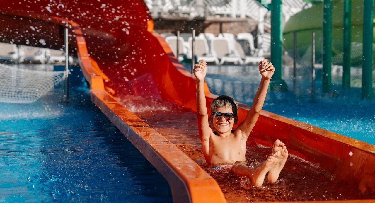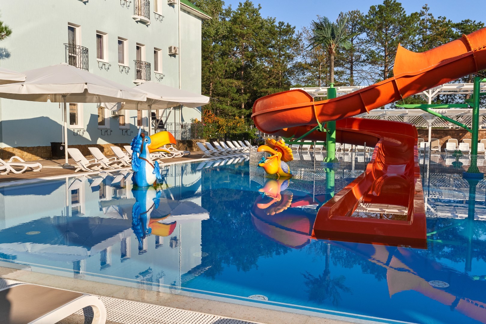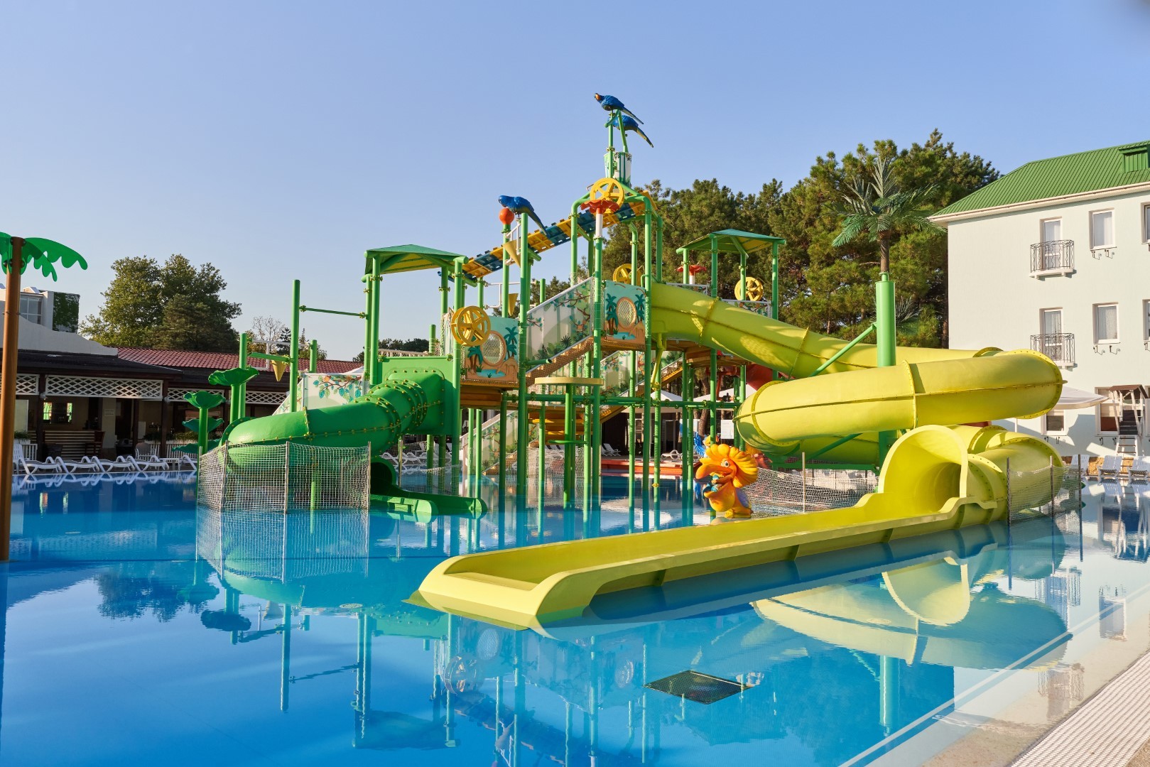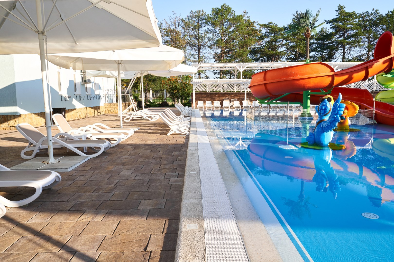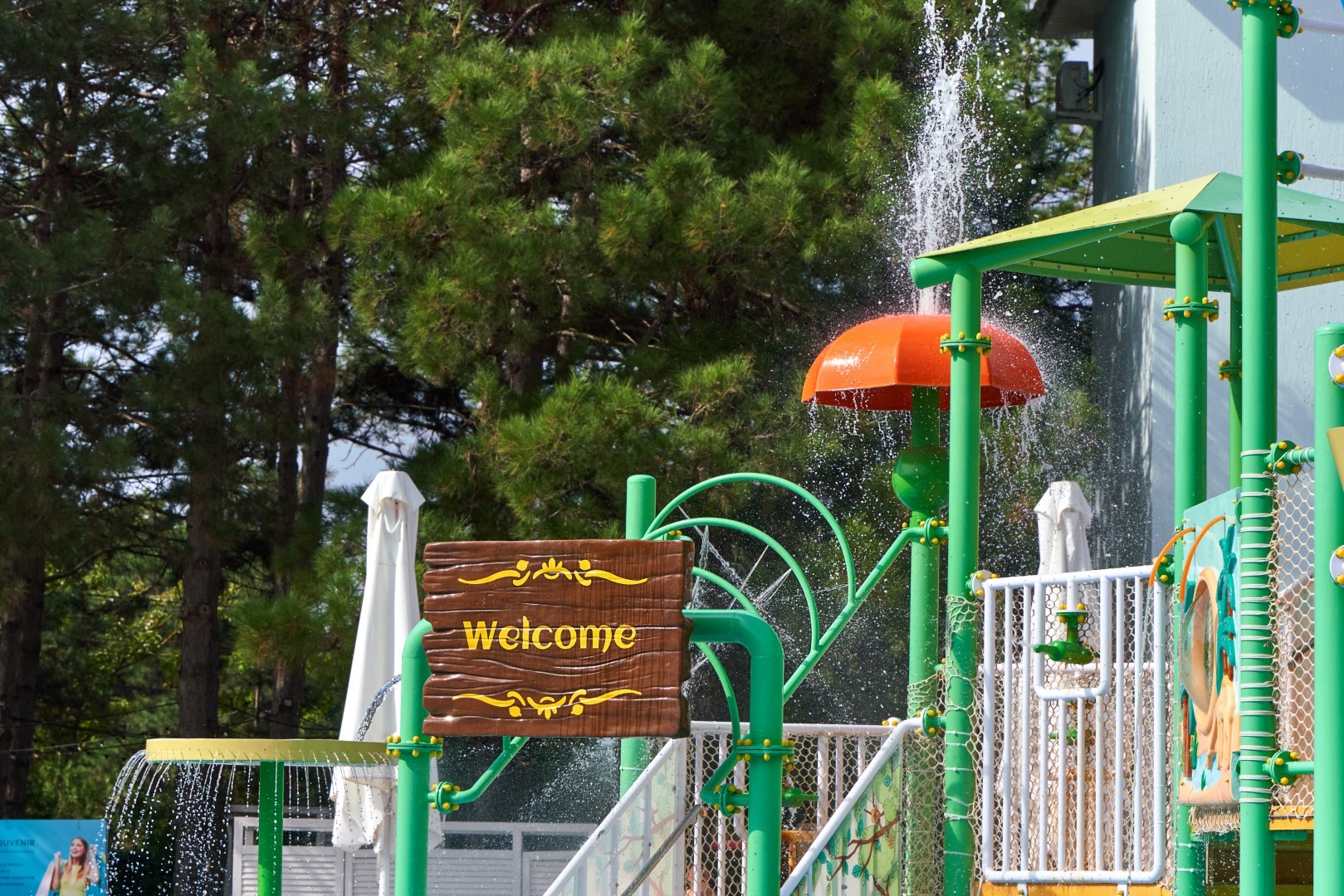 При благоприятных погодных условиях для детей работает новый акваплей - открытый подогреваемый детский бассейн с водными аттракционами 6+