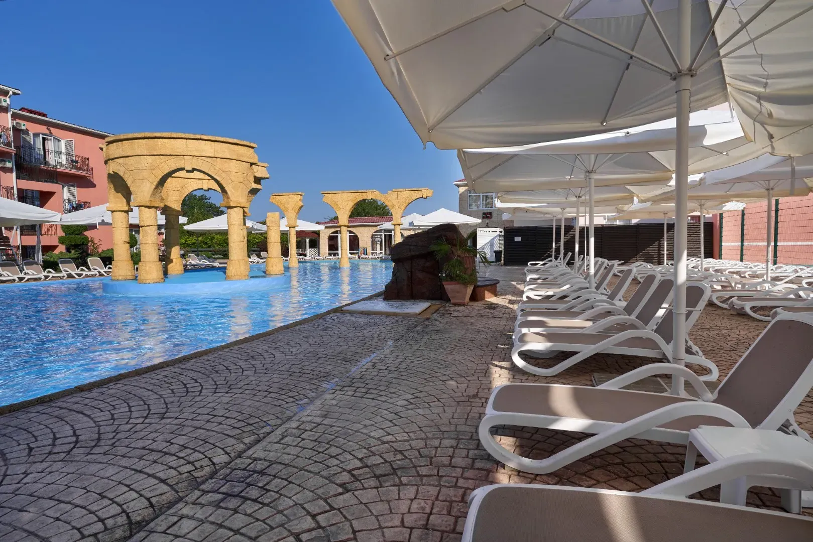 На территории отеля расположен открытый подогреваемый бассейн с ротондой, температура воды в котором поддерживается в идеальных пределах от 26 до 29°C. Это отличное место для отдыха и расслабления для всей семьи. Также для любителей активного отдыха мы предлагаем спортивно-анимационный бассейн, где можно не только плавать, но и участвовать в различных развлекательных мероприятиях.