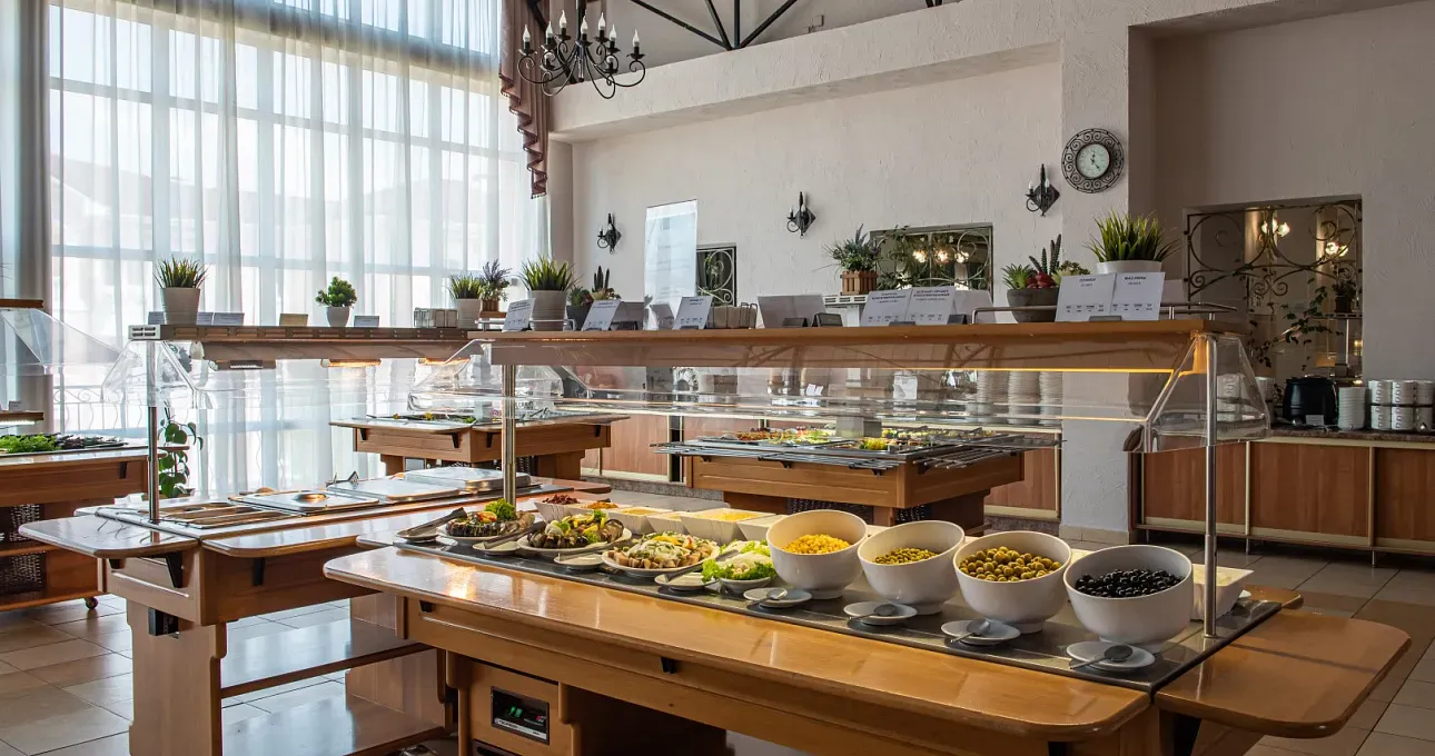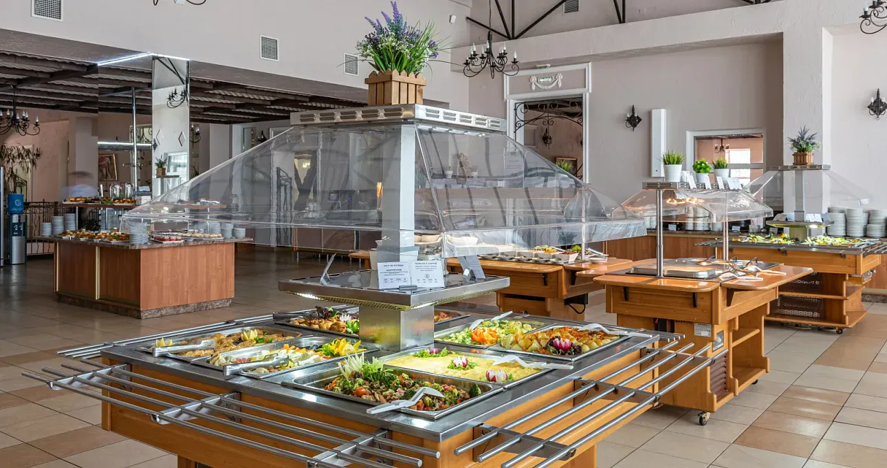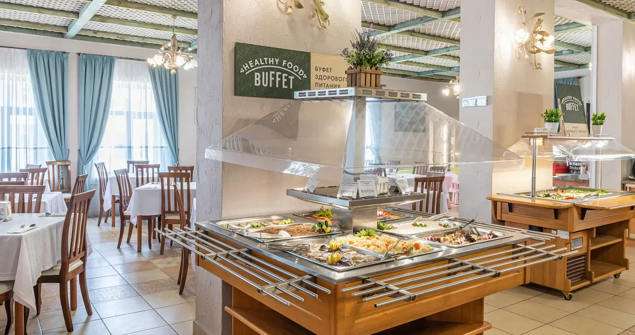 Ежедневное питание организовано по системе «шведский стол», предлагая блюда национальных кухонь Франции, Италии, Греции, Кавказа и Кубани.